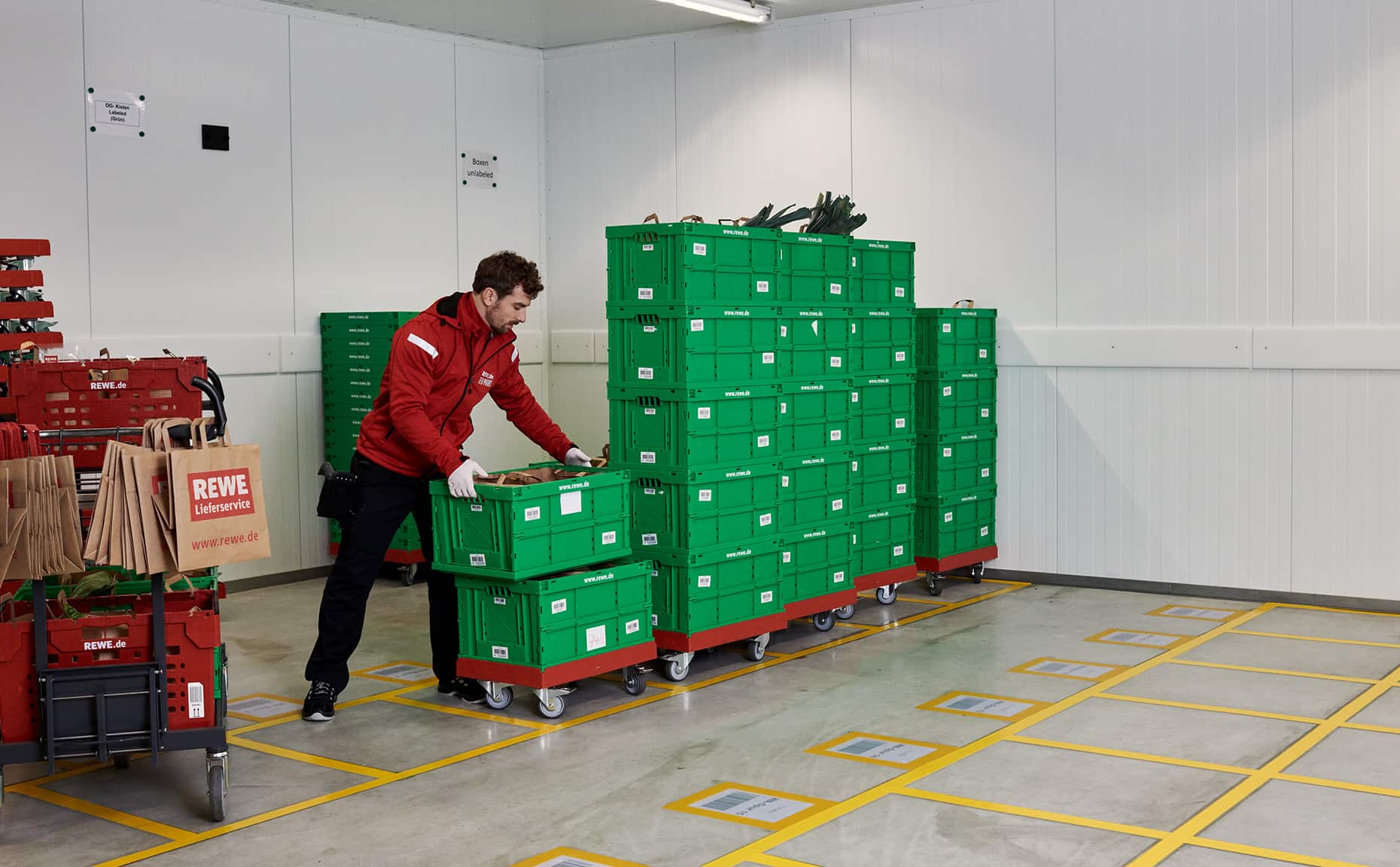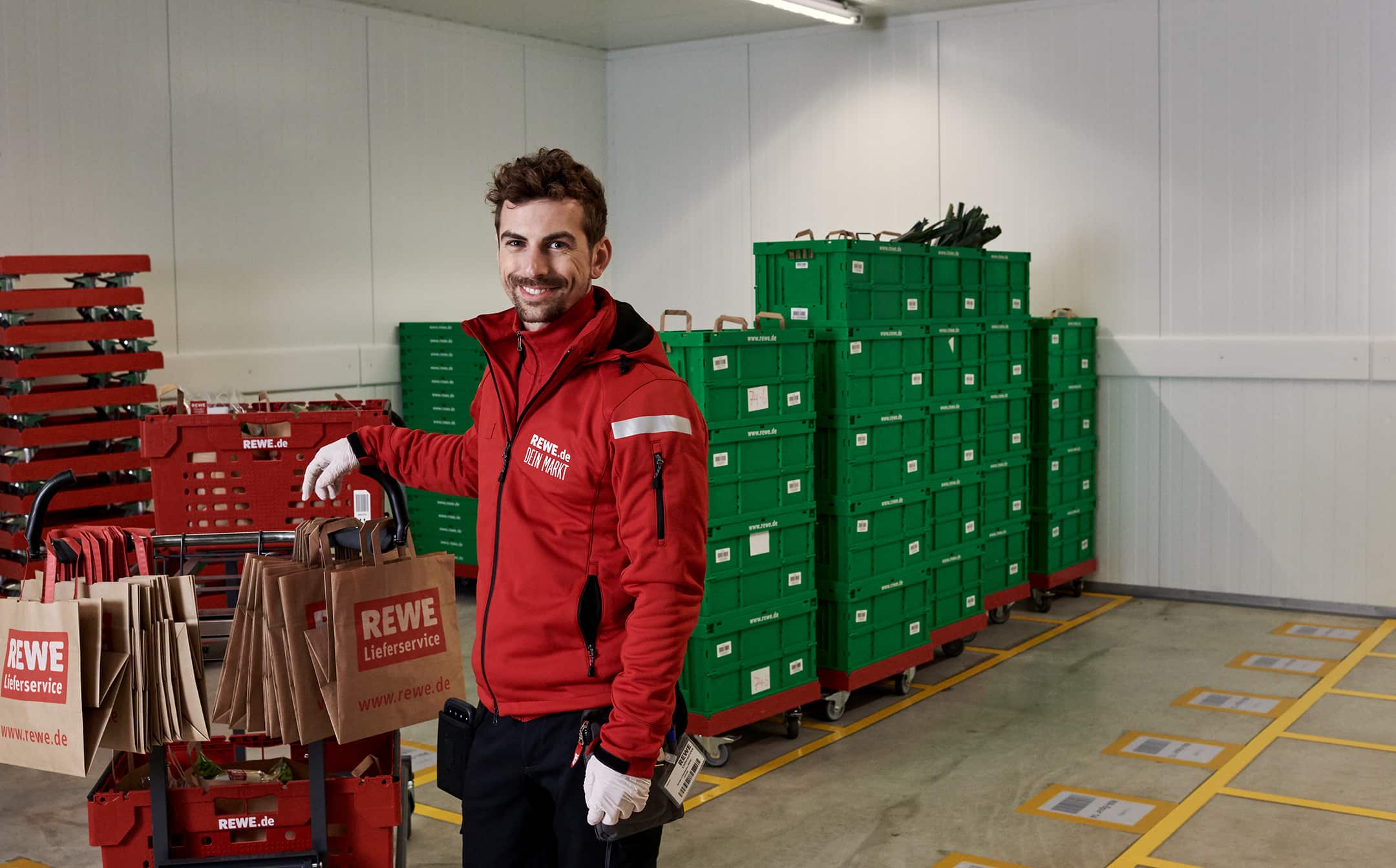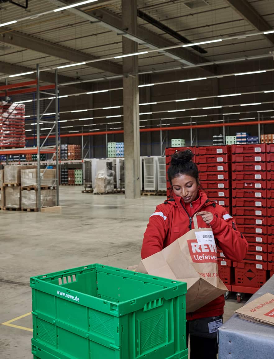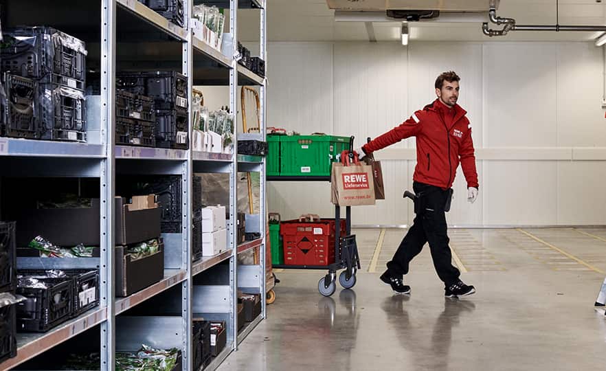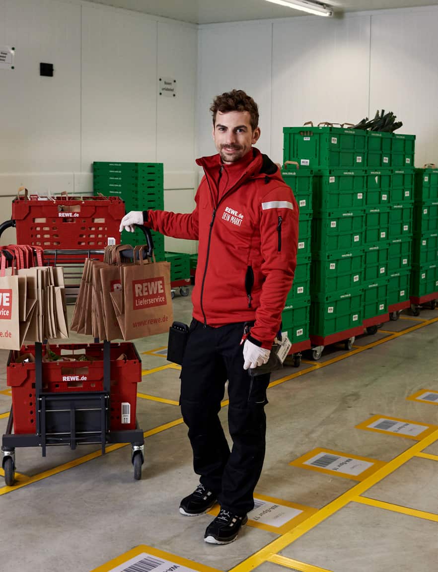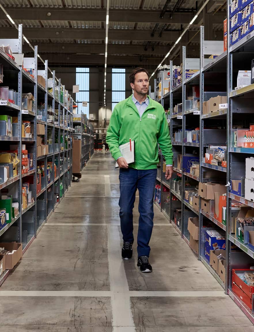 Mit der neuen Bildwelt wollten wir einen ehrlichen Eindruck davon vermitteln, wie es ist, beim REWE Lieferservice zu arbeiten. Dafür haben wir die Atmosphäre im Lager mit hoher Tiefenschärfe festgehalten, ohne vorher aufzuräumen, zu dekorieren oder die Bildausschnitte nachträglich zu verändern.