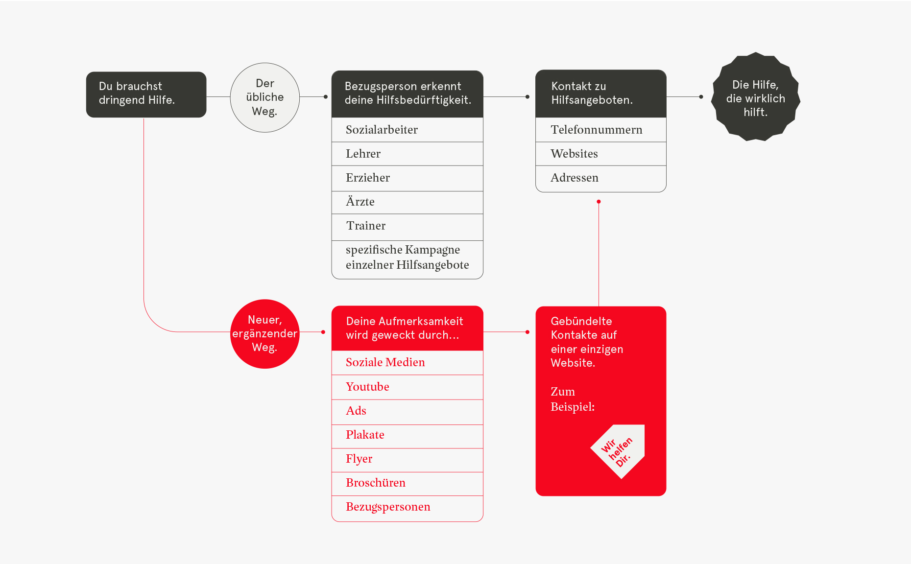 Was es braucht, ist eine Kampagne – aber nicht zu einem einzelnen Thema, sondern zur Hilfesuche generell. Eine bestenfalls crossmediale Kampagne, die Opfer sensibilisiert und zu einer zentralen Anlaufstelle im Netz weiterleitet.