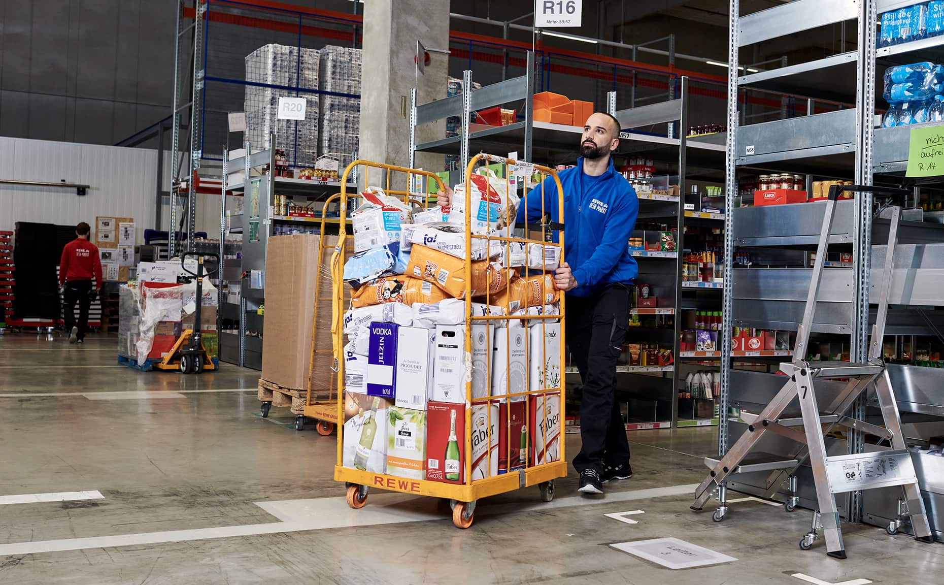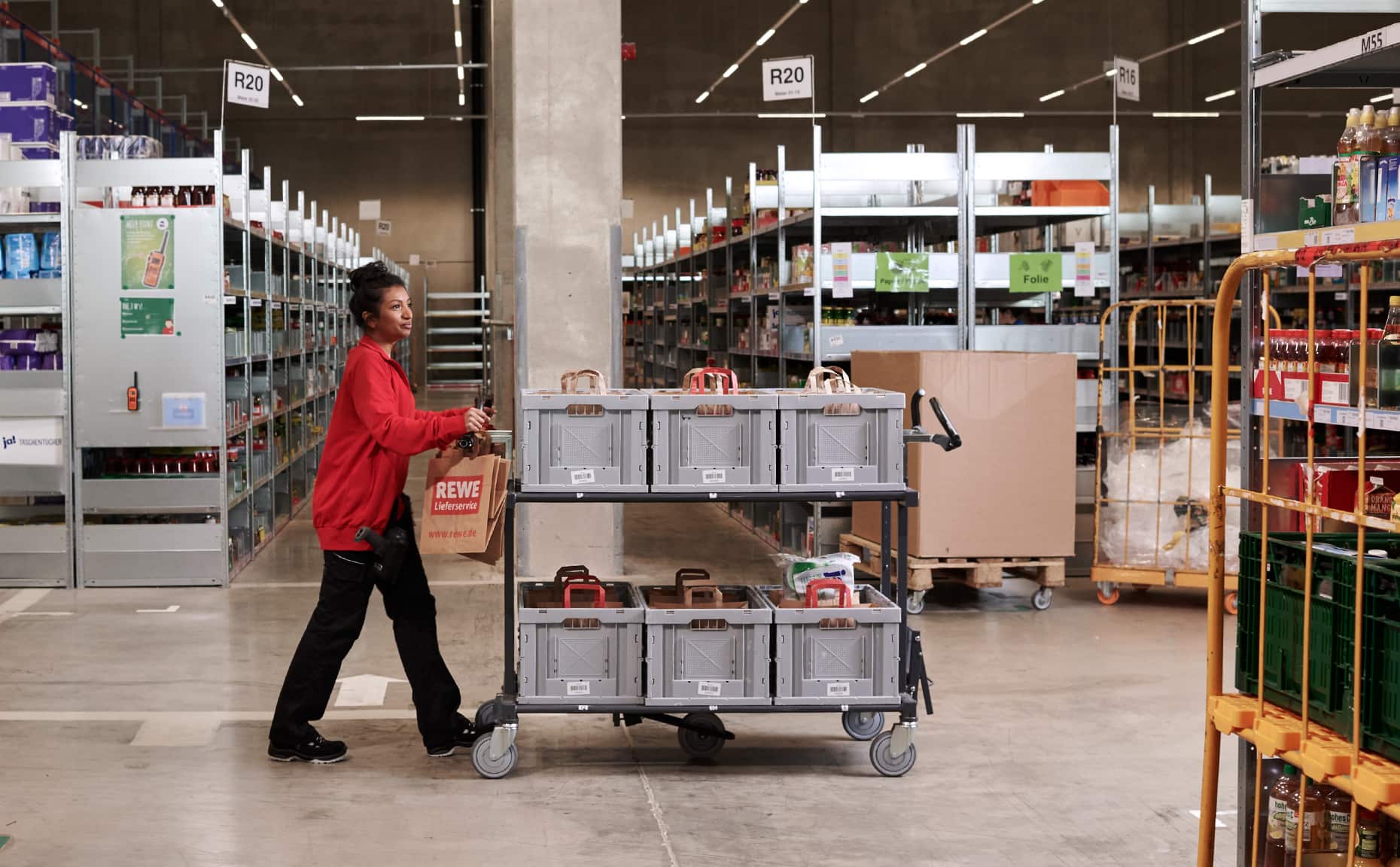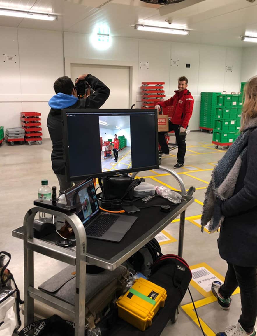 Mit der neuen Bildwelt wollten wir einen ehrlichen Eindruck davon vermitteln, wie es ist, beim REWE Lieferservice zu arbeiten. Dafür haben wir die Atmosphäre im Lager mit hoher Tiefenschärfe festgehalten, ohne vorher aufzuräumen, zu dekorieren oder die Bildausschnitte nachträglich zu verändern.