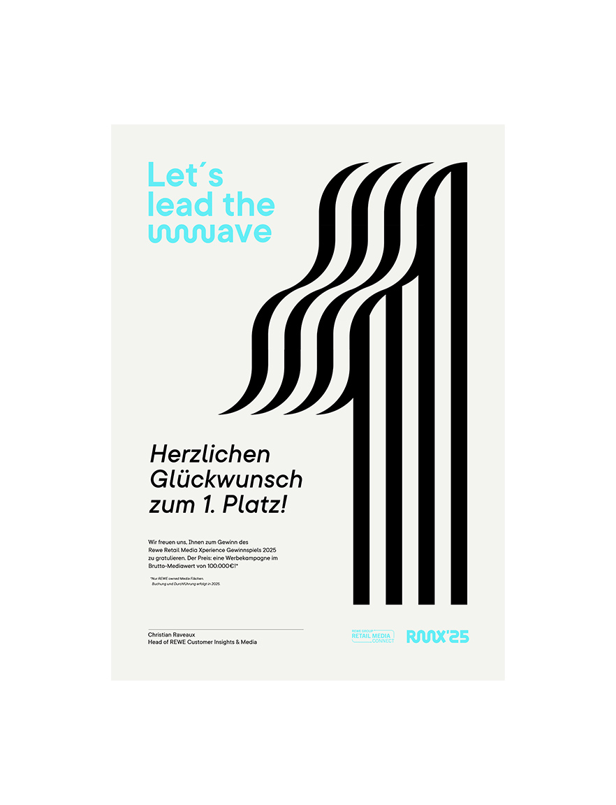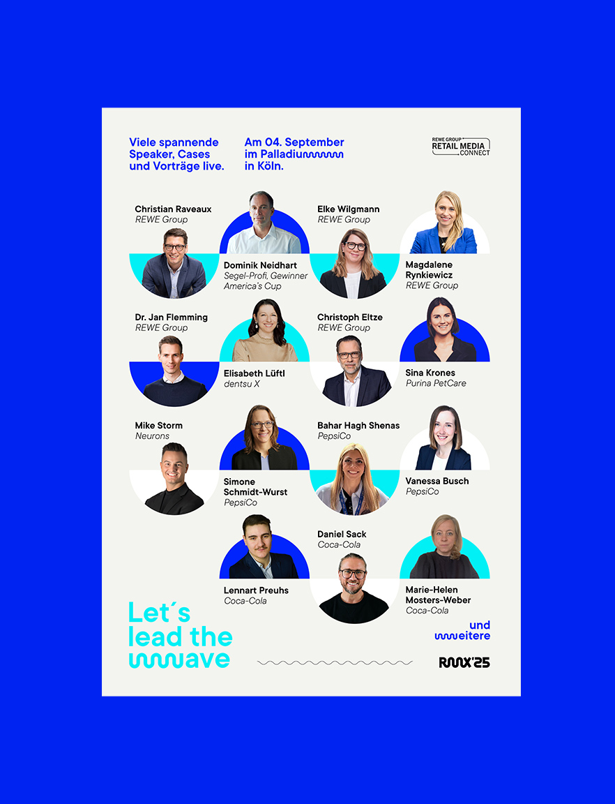 Ein neues Jahr, eine neue Veranstaltung. Auch 2025 wurden wir damit beauftragt, Gestaltung und Umsetzung für die Retail Media Xperience zu übernehmen. Thema dieses Mal: Let´s lead the wave. Denn die REWE Retail Media Connect versteht sich nicht nur als eine der Vorreiterinnen in Sachen Zielgruppenspezifischer Kampagnen - umgesetzt auf allen REWE-Kanälen, von Bannerwerbung bis zum Aufsteller im Markt - sondern lädt ein, auf dieser Welle mit zu reiten.