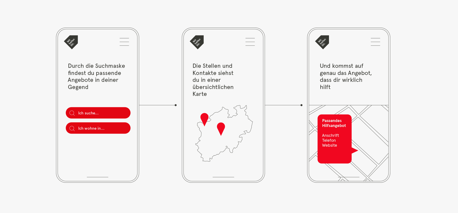 Und es braucht: diese zentrale Anlaufstelle. Denn aktuell sorgen die uneinheitlichen Auftritte der zahlreichen Hilfestellen vor allem für Verwirrung. Es braucht eine vertrauenswürdige Oberfläche, die themen- und ortsabhängig Hilfestellen sucht und auflistet. Wir nennen sie: den Hilfestellen-Finder.
